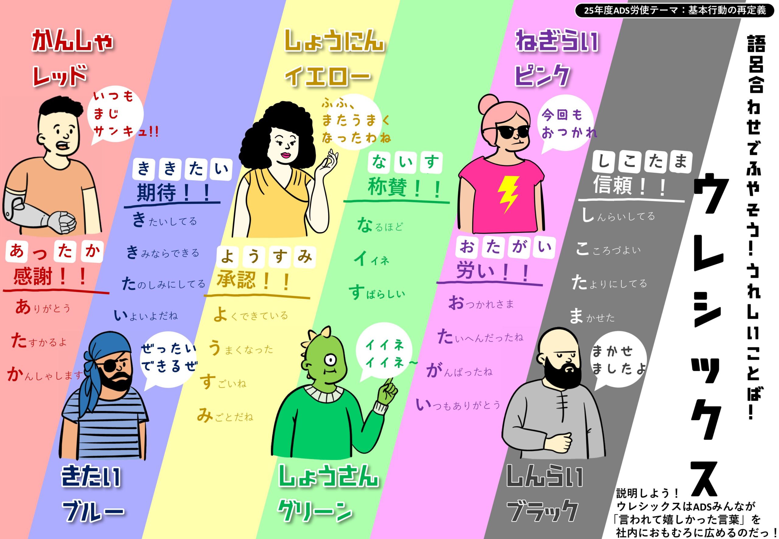 2025年10月某日、アドヴィックス社内にカラフルなポスターが掲示されました。”ウレシックス”と名付けられた6人組のキャラクターが並ぶデザインは従業員の目を引き、瞬く間に話題となりました。ウレシックスは、言われてうれしい言葉を社内で広めるために生み出されたヒーロー戦隊。労使事務局が主体となって進める企業風土づくりの一環として誕生しました。